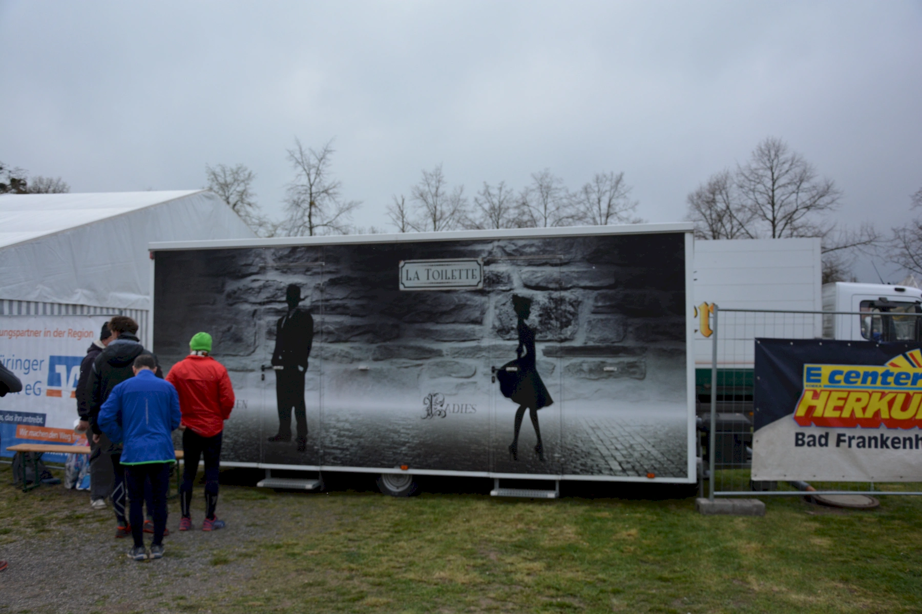 Im Gegensatz zur Marathonstrecke ging es von Bad Frankenhausen über Ratsfeld bis Dreiforstein nicht stetig bergan, sondern nur steil bergauf um von dort die gemeinsame Streckenführung wie die Marathonis unter die Laufschuhe zu nehmen. Gleich neben dem Start- und Zielbereich auf dem Schlossplatz konnten die Teilnehmer in der angrenzenden Bade-Therme die warmen Duschen kostenlos nutzen.
