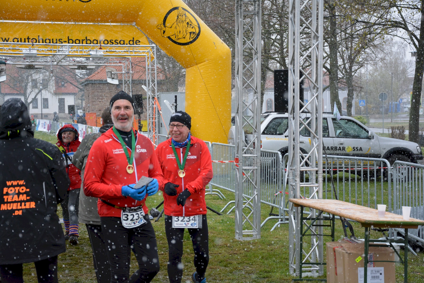 Am Samstagmorgen um 8:30 Uhr gingen 5 Läufer/-Innen auf die anspruchsvolle Marathonstrecke. Von Bad Frankenhausen bei knapp 0 Grad und leichtem Schneefall führte die Stecke stetig bergan, an der Barbarossahöhle vorbei, über Steinthaleben bis Hüflar, dort bog man von der Strasse rechts ab in den Wald, der mit einer leichten Schneedecke bedeckt war, Richtung Fernsehturm bis zum Kyffhäuser Denkmal, wo der höchste Punkt erreicht war. Leicht bergab bis Dreiforstein um dann gemeinsam mit der Halbmarathonstrecke den weitern Streckenverlauf wieder leicht bergauf bis Seebersbrunnen zurückzulegen. Von dort an führte die Strecke über Udersleben gut bergab wobei der Untergrund mit Geröll schwierig zu laufen war. Zum Flugplatz noch einmal eine kurze aber knackige Steigung und dann unwegsam durch Feld und Flur bis zum Panorama Museum. Von dort ging es auf glitschigem Untergrund bis zur Stadtgrenze Bad Frankenhausen ziemlich steil bergab. Dann konnten auf den letzten 2 Km, auf guten gepflasterten Strassen die letzten Reserven freigemacht werden, um ins Ziel einzulaufen.