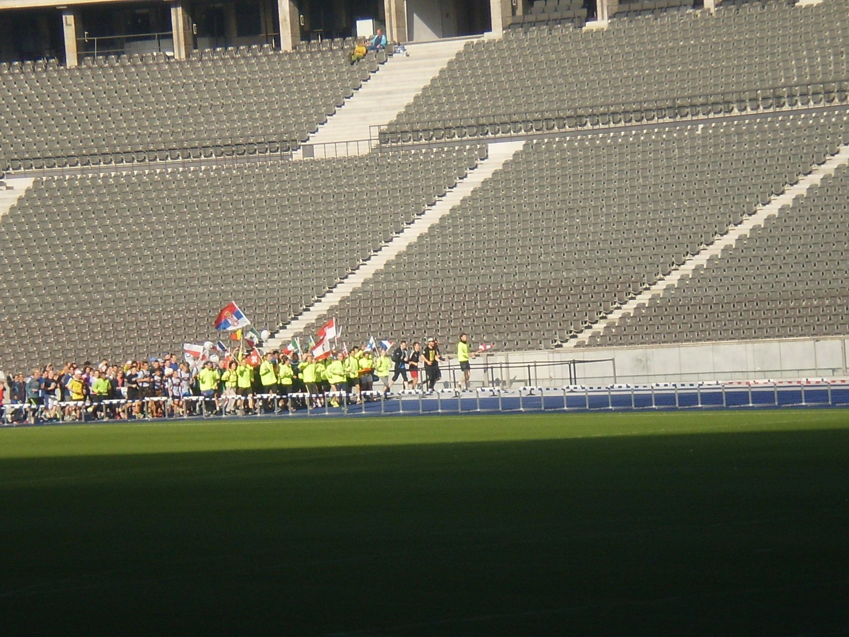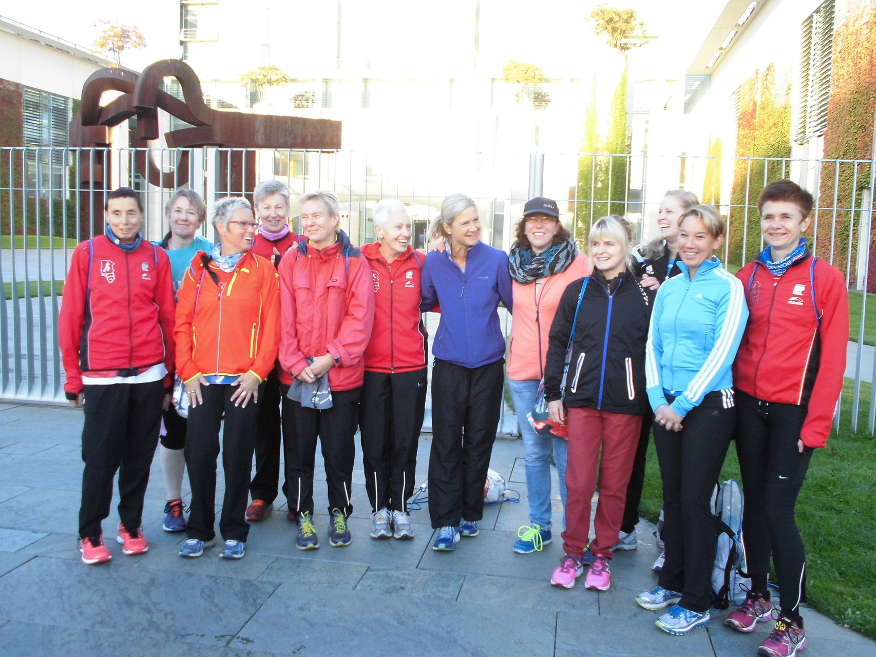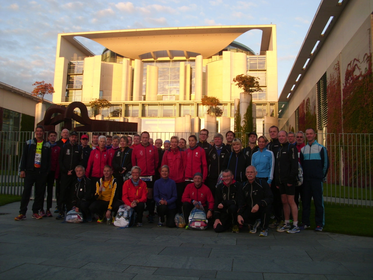 Wer nicht der Erste sein konnte, lief seine Zeit und seinen persönlichen Rekord. Die Bedingungen waren sehr günstig, angenehme Temperaturen und trockenes Wetter. Unter dem Jubel von einer Millionen Zuschauern und der Begleitung zahlreicher Musikbands erreichten beinah alle das Ziel hinter dem Brandenburger Tor. Beim Lauf durch das Brandenburger Tor und einem Bad in der Menge lief so manchem eine Gänsehaut über den Rücken. Jeder lief seine „Tagesbestzeit“. Das traditionelle Foto zeigt die Lauffreunde vor dem Bundeskanzleramt im Berliner Regierungsviertel.