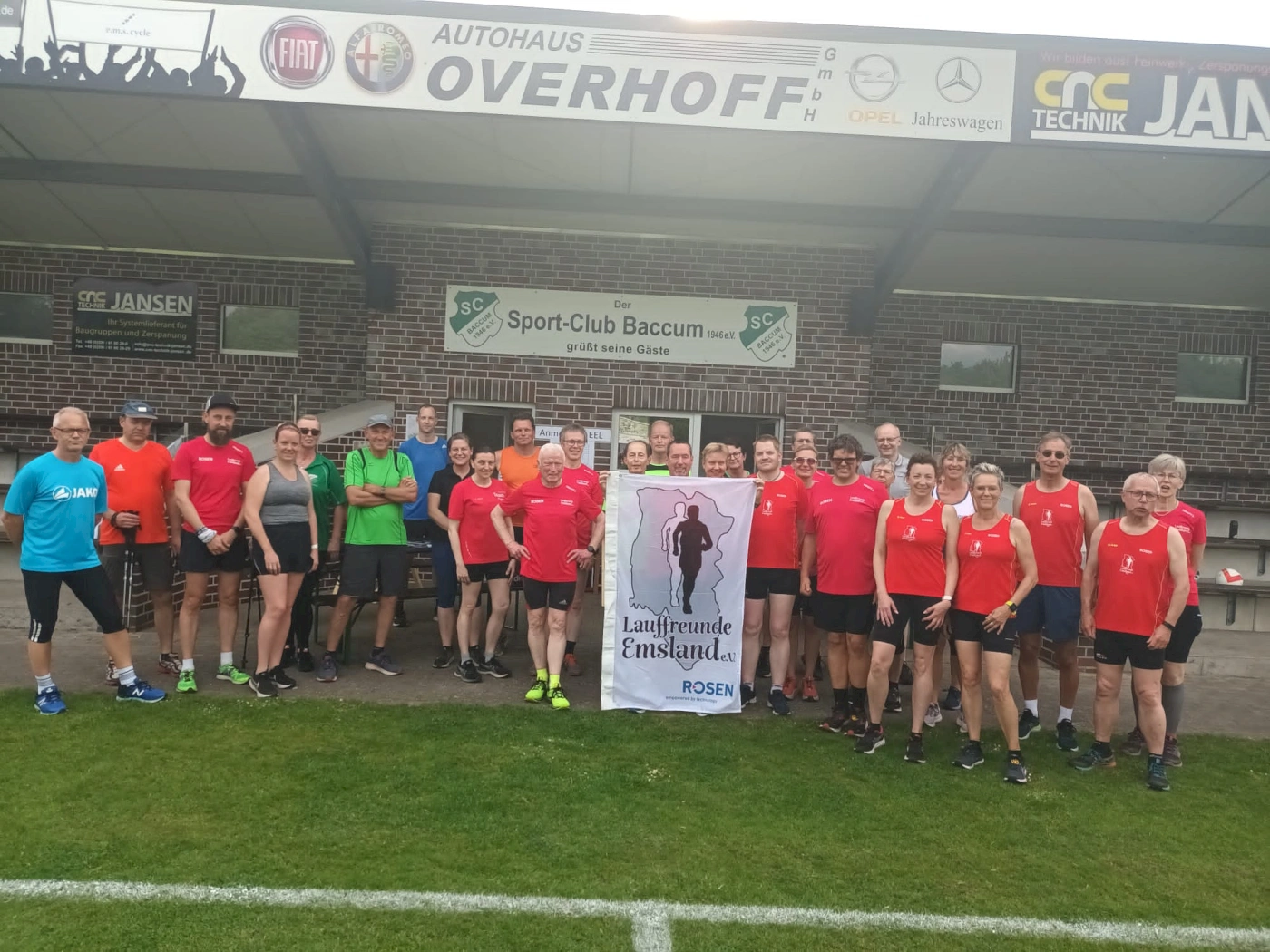 Bei warmen sommerlichen Temperaturen fand sich auf dem Sportplatz rd. 30 Läuferinnen und Läufer ein, um gemeinsam ein Runde um Baccum zu laufen.