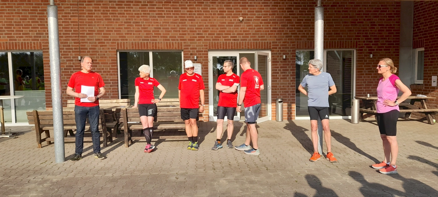Gruppe von Läufern in roten Trikots und gelben Warnwesten, die an einer Strecke stehen, während ein Mann am Tisch mit Getränken bereitsteht. Die Szene findet bei sonnigem Wetter und klarem Himmel statt, umgeben von grüner Landschaft und Bäumen.