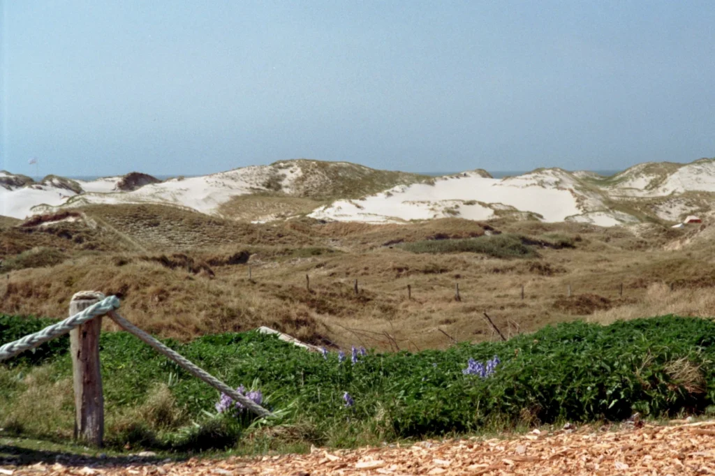 Sanddüne mit feinem, welligem Sand und Grasbewuchs unter einem klaren blauen Himmel.