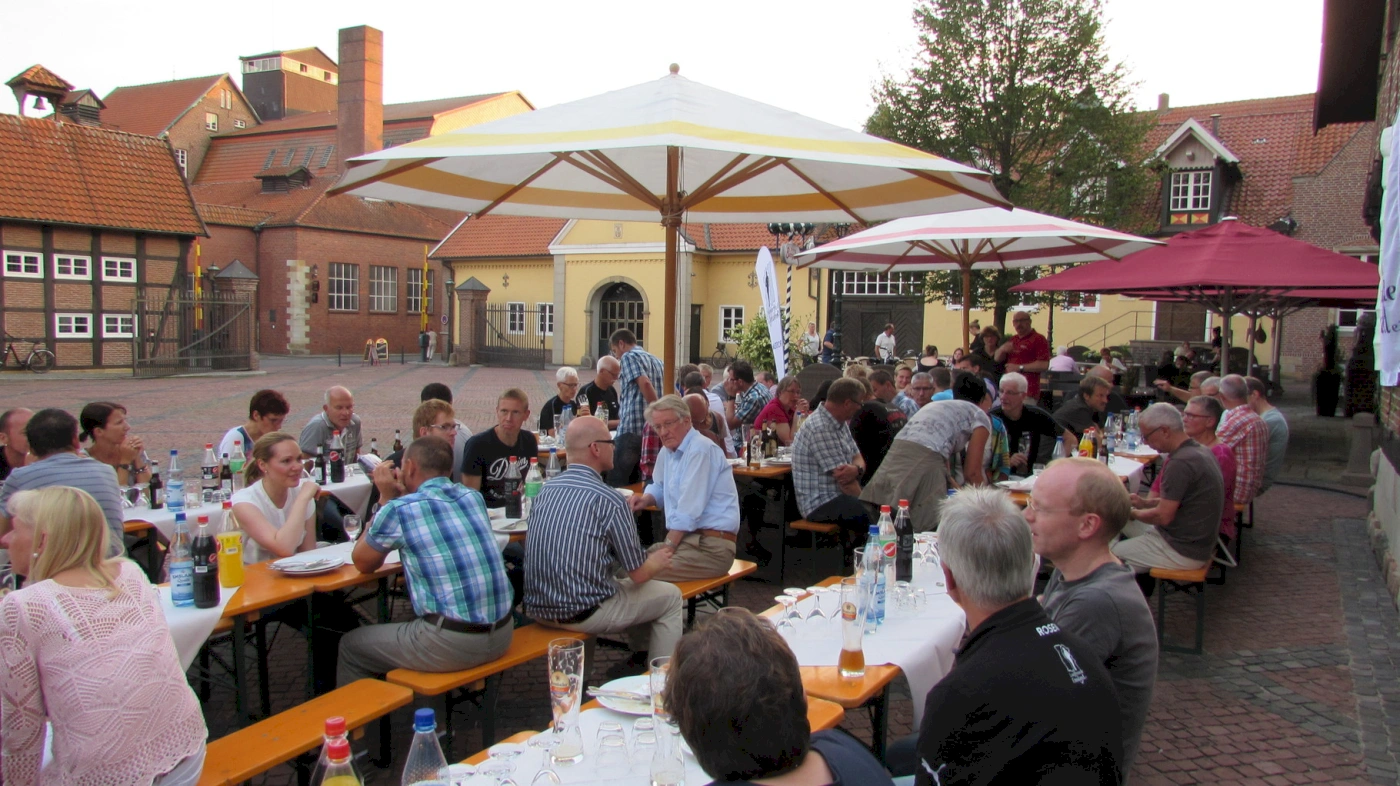 Der Einladung zum Jubilauf kamen rund 45 Läuferinnen und Läufer nach und liefen pünktlich um 17 Uhr vom Freibad in Haselünne, auf die von Thomas ausgesuchte wunderschöne Strecke rund ums Hasetal, los. Nach ca. 8 Km Laufen und anschließenden Duschen trafen die Aktiven zu den schon wartenden anderen Mitgliedern im Burghof Berentzen. Christa hatte alles mit ihrem Team draußen im Burghof vorbereitet und bei herrlichem Sommerwetter konnten wir uns nach dem Sektempfang an der Nudelparty für den geselligen Abend stärken. Nach den kurzen Festreden von Günter und Karl-Otto konnte noch das Paar Laufschuhe, gesponsert von Sport Langen aus Haselünne, unter allen vorangemeldeten Mitgliedern verlost werden. Renate Schnelting war die Glückliche.