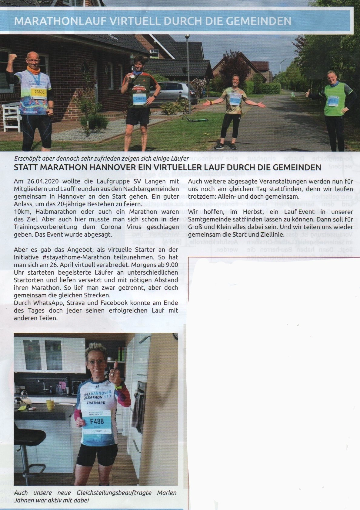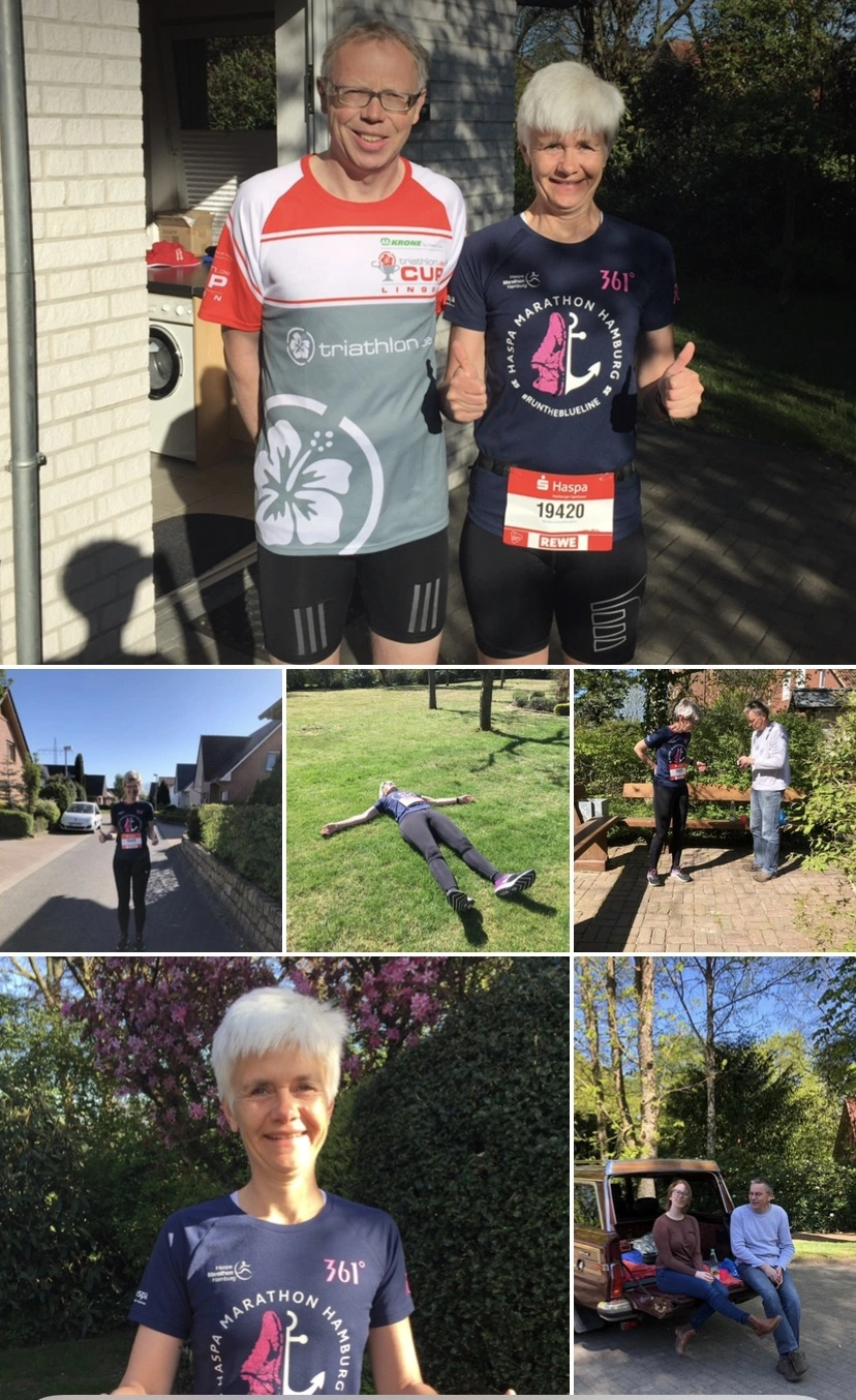 Wir, d.h. Ursula kleine Arkenau und Claudia Lübbers, waren für Hamburg am 19. April 2020 gemeldet. Den Halbmarathon sind  wir dann mit Unterstützung der Familie jeweils getrennt in Cloppenburg und Meppen gelaufen. Vielleicht können wir im Frühjahr 2022 gemeinsam in Hamburg zum Marathon an den Start gehen.