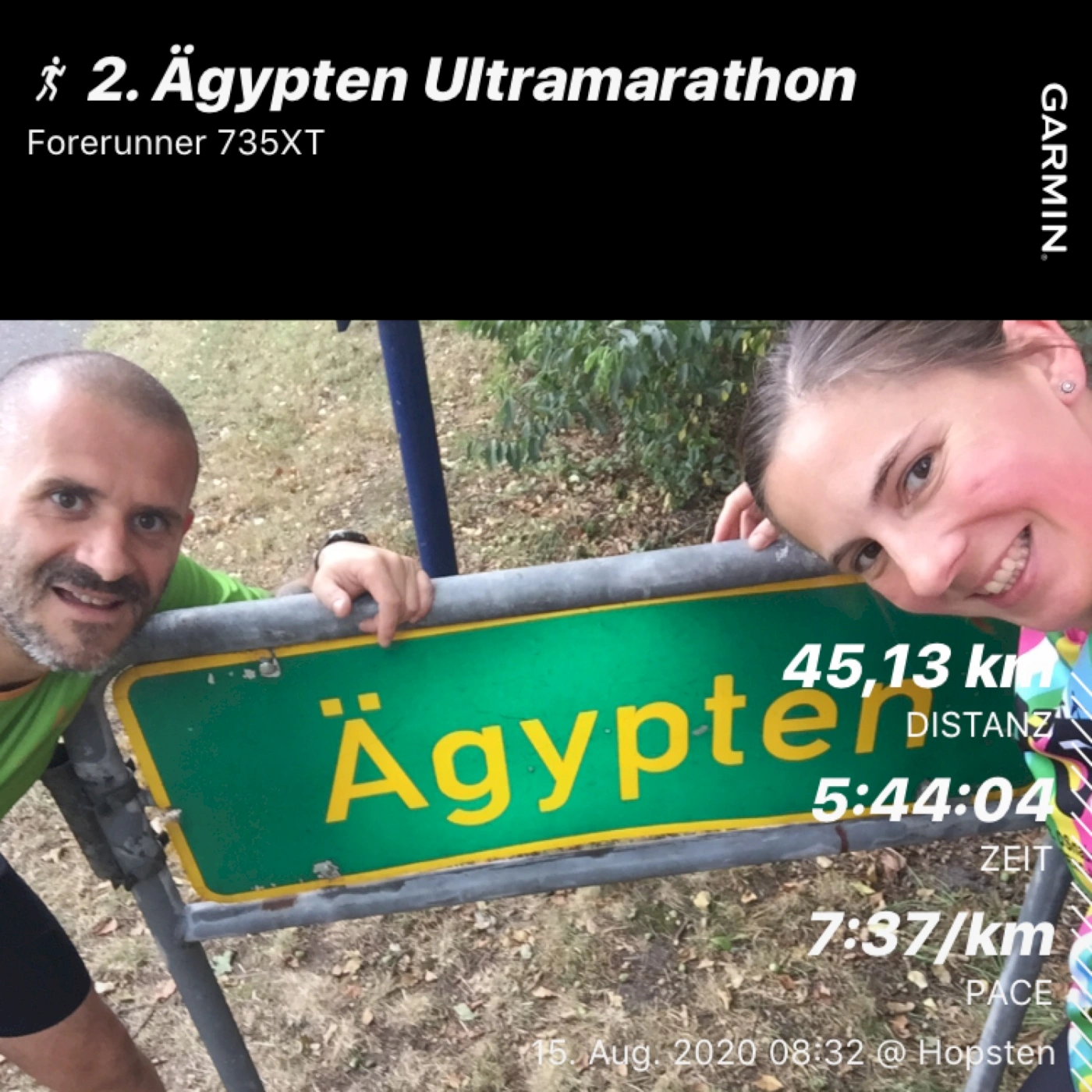 Dort waren insgesamt 15 Starter, die eine 2,81 km lange, flache Wendepunktstrecke entweder 8 Runden oder 4 Runden durch Ägypten (in Hopsten) gelaufen sind. So kamen 45 bzw. 22,5 km zusammen.