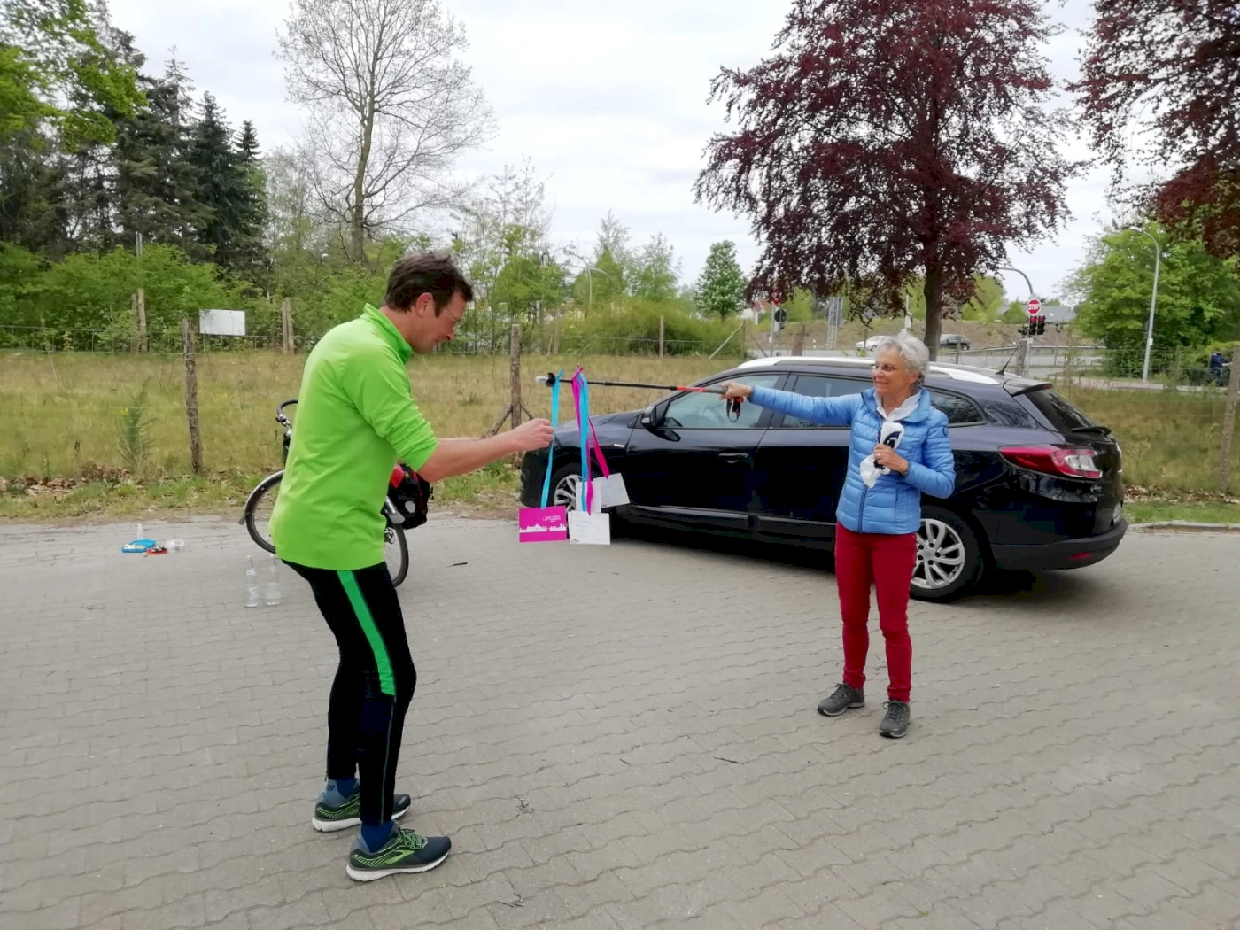 Claudia Lübbers und auf dem Begleitfahrzeug (Fahrrad) Erika Kappel, die ebenfalls die Verpflegung der Läuferinnen und Läufer übernommen hat.
