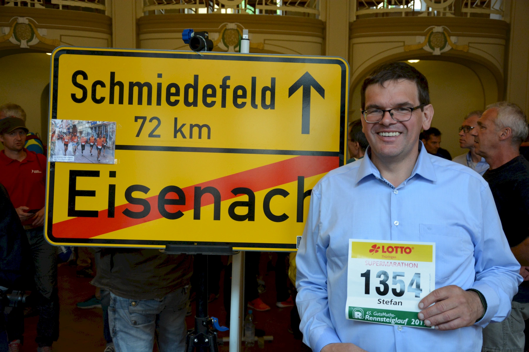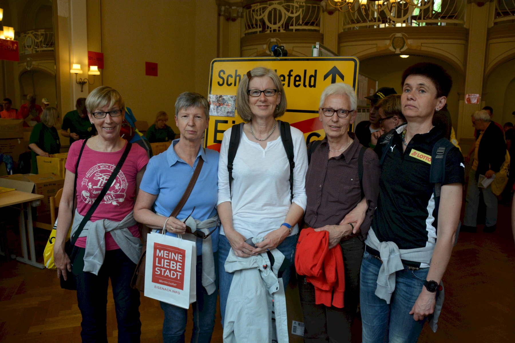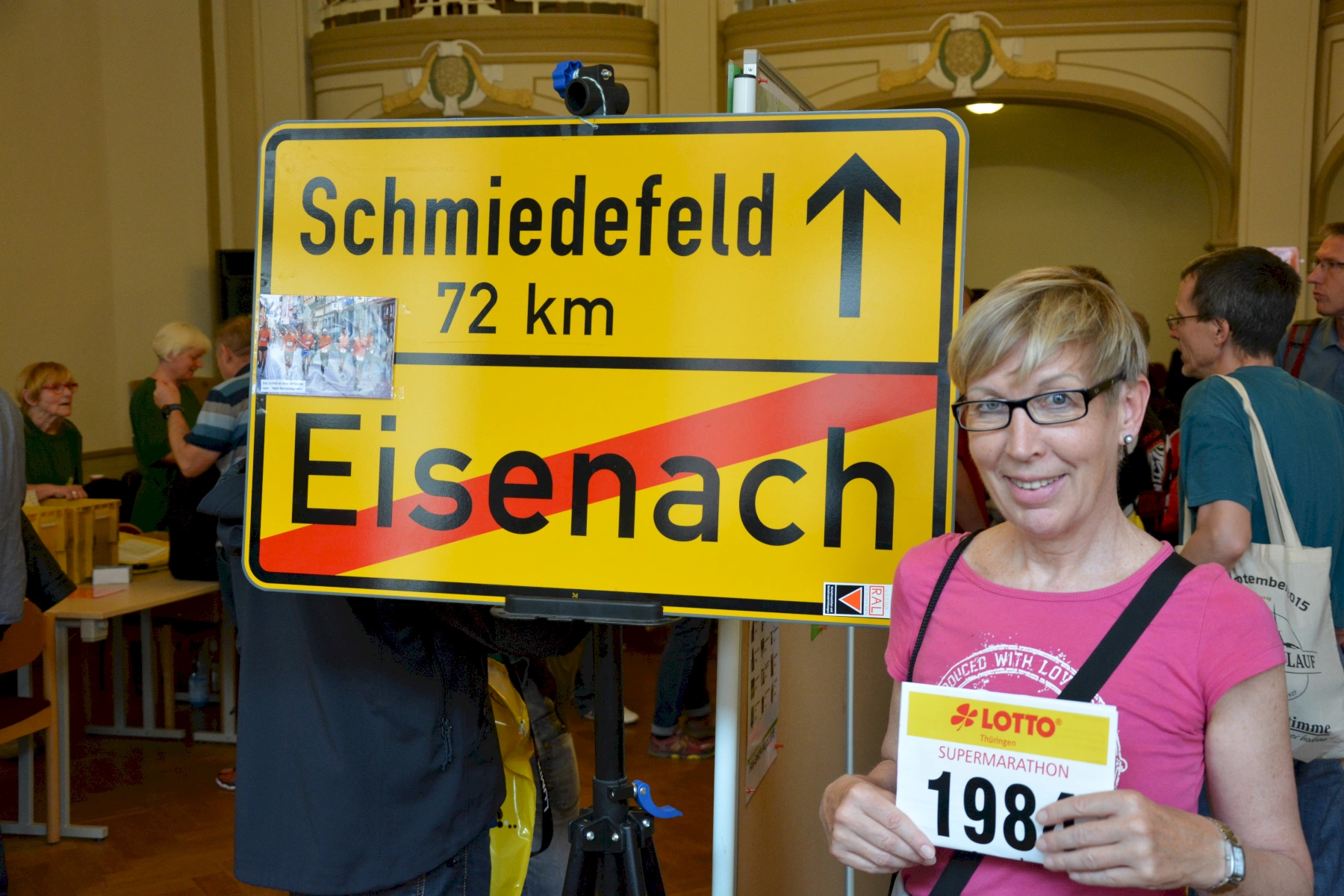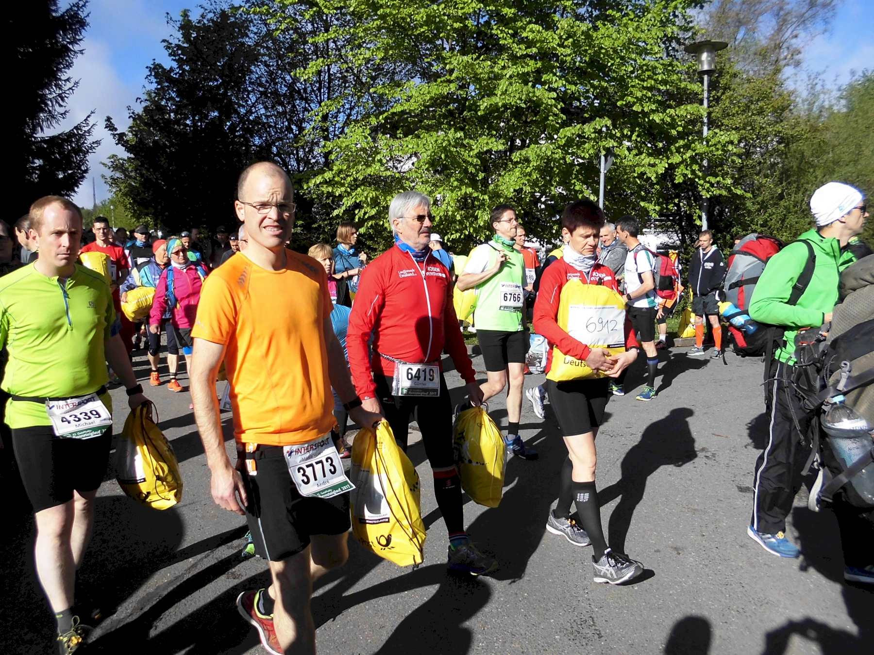 Die folgende Nacht war kurz, um 04.30 Uhr wurde gefrühstückt. So gestärkt begaben sich die „Ultras“: Ingrid und Hermann Jänen, Angela, Sonja, Klaus und Stefan zum Start (06.00 Uhr) am Marktplatz von Eisenach. Sonja und Stefan nahmen den Supermarathon, der in diesem Jahr von 72,7 km auf 73,5 km verlängert worden war, zum ersten Mal in Angriff!