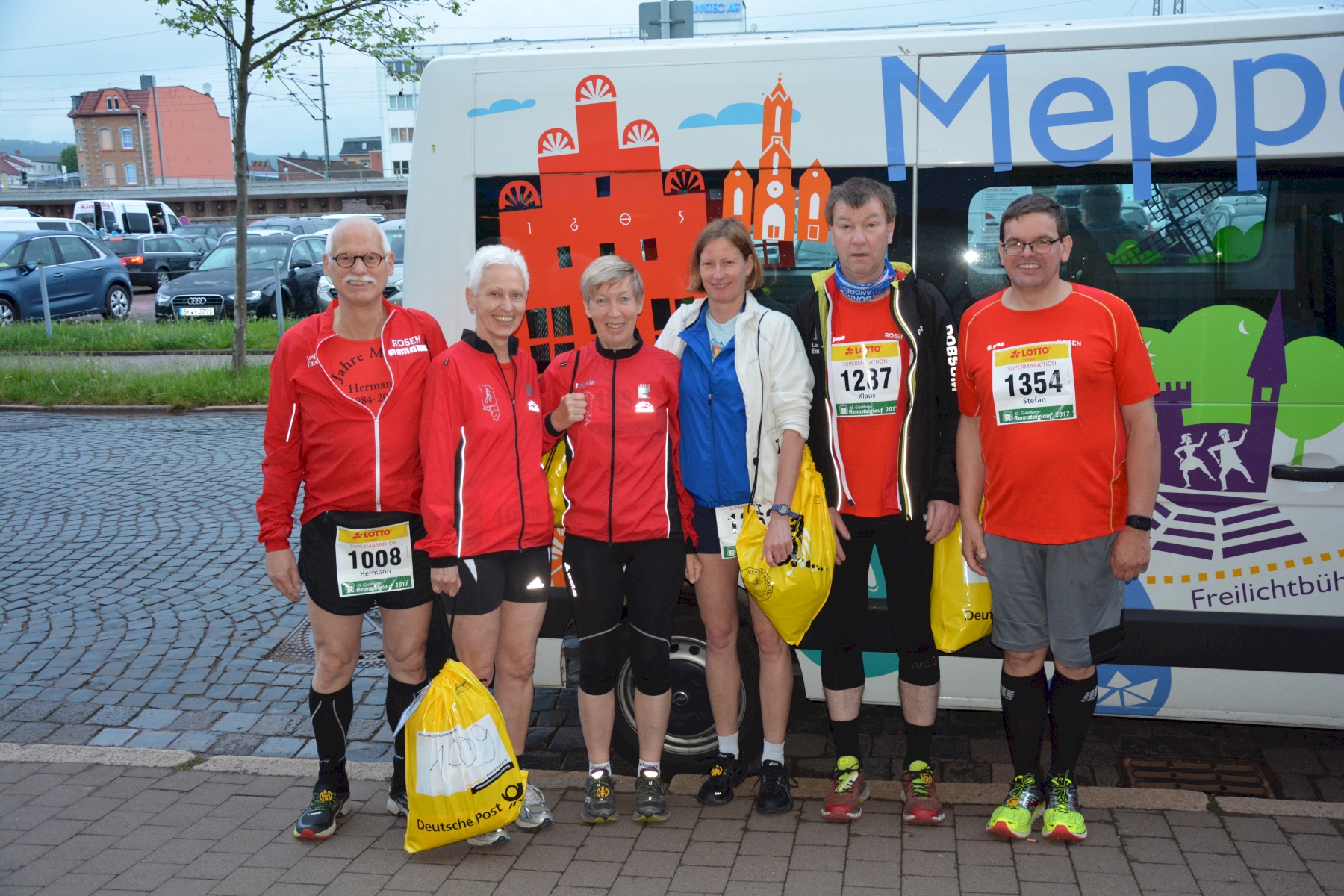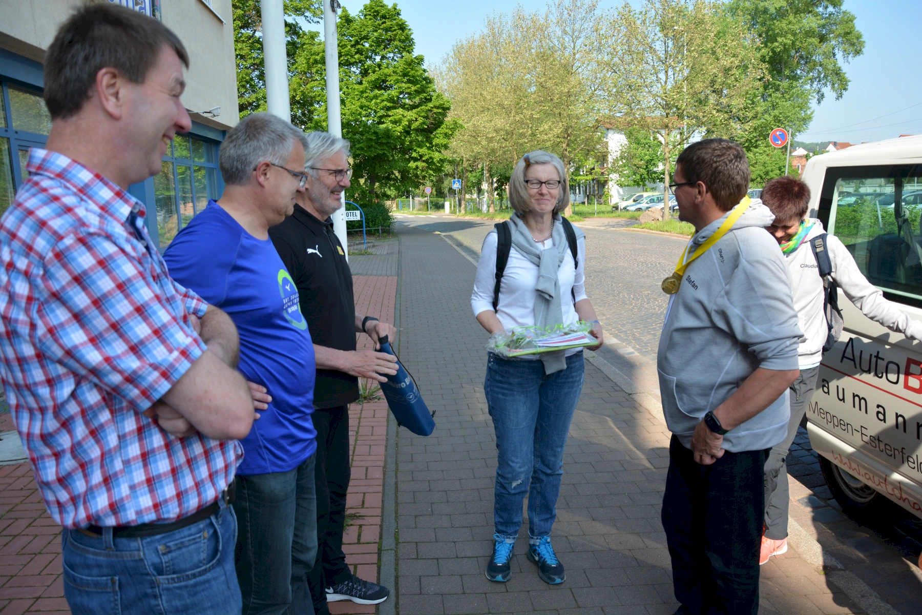 Unsere „guten Geister“, Ingo und Helmut brachten die „Marathonis“: Ingrid und Hansi Kuper, Claudia, Beate, Bernd, Günter und Hermann K. mit dem Kleinbus nach Neustadt am Rennweg, von wo der Marathon (09.00 Uhr) gestartet wurde.