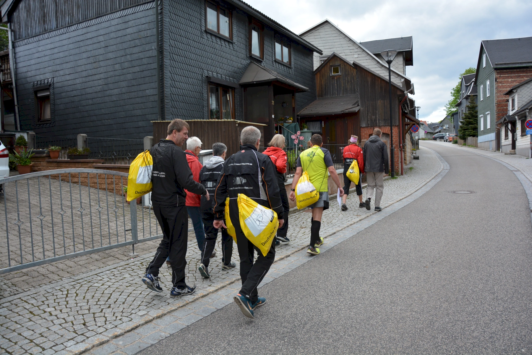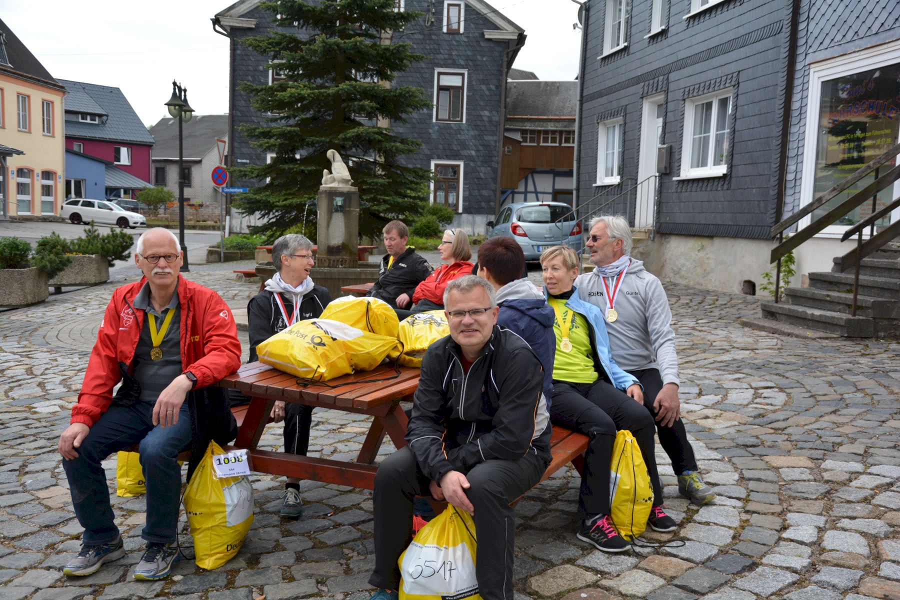 Allen Wetterprognosen zum Trotz zeigte der Himmel seine blaue Seite und die Temperaturen waren absolut Läufer freundlich! Also, ideale Voraussetzungen, um das Ziel in Schmiedefeld zu erreichen. Und es war Gänsehaut pur, als nach und alle Läuferinnen und Läufer in Schmiedefeld einliefen, wo Ingo und Helmut schon auf uns warteten.