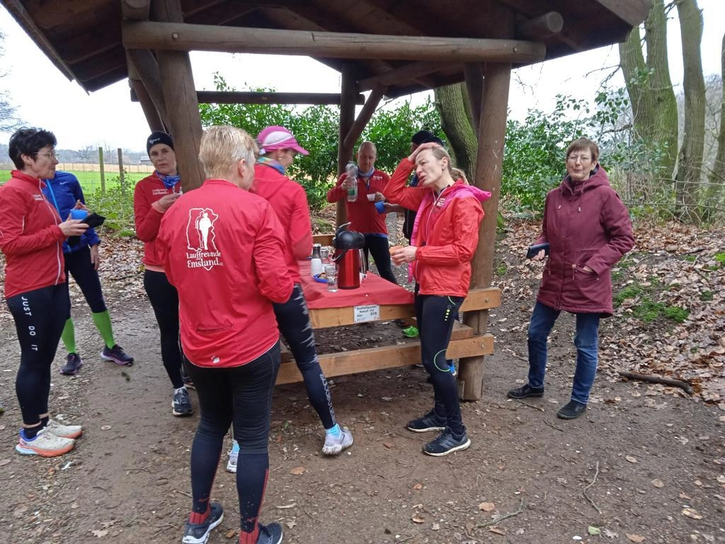 Das Wetter gönnte uns von 14:00 bis 16:30 Uhr eine kleine Regenpause, so dass wir trocken ins Ziel kamen. Alle Strecken führten über die Panzerbrücke in das Erholungsgebiet „Lohner Sand“ und die lange Distanz bis nach Nordlohne. Dort gab es bei einer kurzen Rast Tee, Wasser und Kekse.