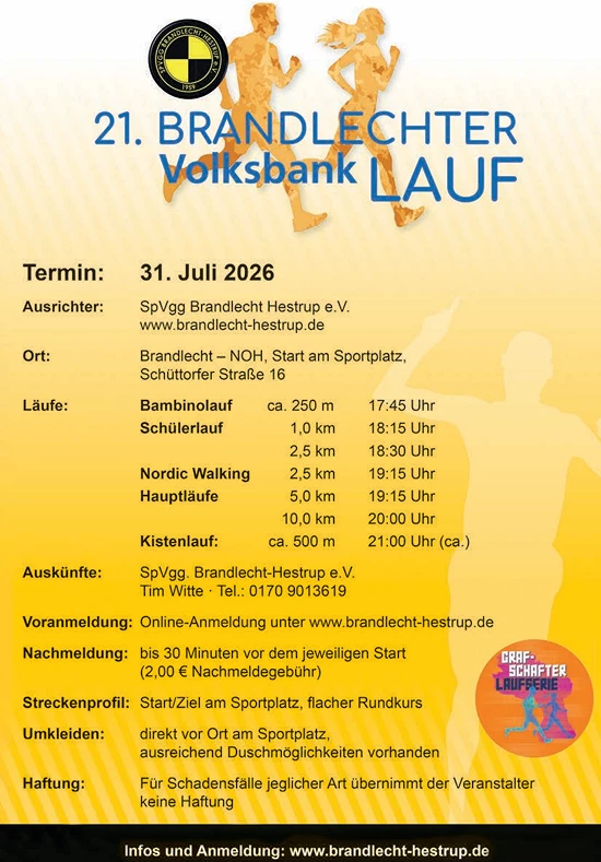 31.07.202621. Brandlechter Volksbank LaufOrt: Brandlecht - NOH, Start am Sportplatz, Schüttorfer Str. 16Veranstalter: SpVgg Brandlecht Hestrup e.V.zur offiziellen Webseite